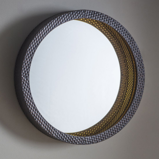 A unique hammered effect mirror with a deep two tone frame. FEATURES : Material : Glass, Iron Finish : Black, Gold Portrait Hanging Orientation Plain Glass Type Keyhole Fixing Type Available at an affordable price Images shown are for illustration purpose only DIMENSIONS : Height : 510mm Width : 510mm Depth : 90mm